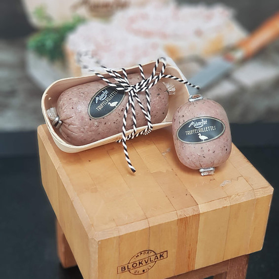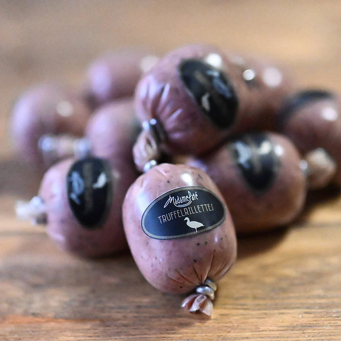 Nieuw in het assortiment van Madame Paté: truffelrillettes gemaakt van Hollandse Wilde Gans. Gans heerlijk! De rillettes worden geleverd in een bakje van 150 gram en 8 bolletjes (waarvan 2 gratis).